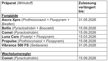 Das Bundesamt für Verbraucherschutz und Lebensmittelsicherheit hat die durch Zeitablauf endenden Zulassungen einiger Pflanzenschutzmittel verlängert.
