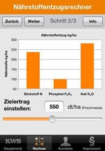 In Zusammenarbeit mit Möller Agrarmarketing e.K. wurde ein mobiler Nährstoffentzugsrechner in die App integriert. Damit können Landwirte schnell und unkompliziert ermitteln, welche Nährstoffmengen (Stickstoff, Phosphor, Kali) dem Boden durch den Maisanbau entzogen werden. Der Landwirt wählt zu Beginn der Kalkulation seine gewünschte Nutzungsrichtung (Silo- oder Körnermais mit verschiedenen TS-Gehalten) sowie den zu erwartenden Zielertrag an Frischmasse aus. Danach berechnet die App auf Basisdaten der LfL bzw. Düngeverordnung den Nährstoffentzug. Die App ist sowohl für iPhone- als auch für Android-Benutzer in den entsprechenden Stores erhältlich. Innovative Ideen für die Weiterentwicklung der App wurden Anfang 2012 von KWS und...