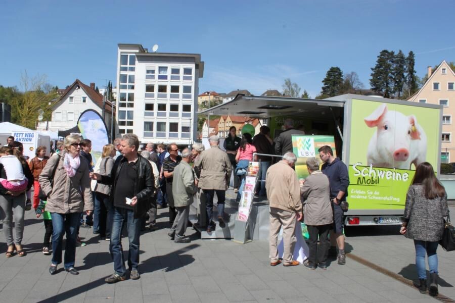 Mit der Schweine-Tour Baden-Württemberg informieren der LBV und Kreisbau-ernverbände in unterschiedlichen Städten und Gemeinden wie Backnang, Mannheim, Albstadt-Pfeffingen und Schwäbisch Gmünd die Verbraucher vor Ort über heutige Produktionsbedingungen in der Schweinehaltung.
