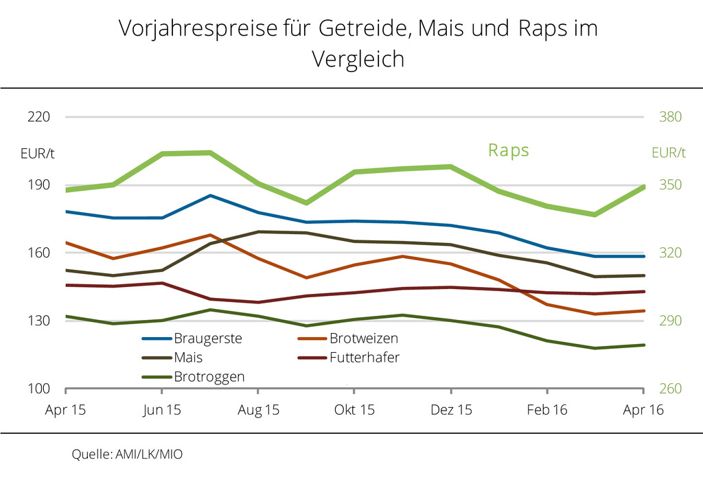 Nach einem kräftigen Anstieg in den vergangenen Monaten sind die Rapspreise im April 2016 nicht nur auf das höchste Niveau seit Ende 2015 gestiegen, sondern kletterten sogar über Vorjahreslinie. Damit ist Raps nach Angaben der Agrarmarkt Informations-Gesellschaft (mbH) derzeit der Gewinner unter den Ackerfrüchten. Denn für alle Getreidearten wie auch Mais erhalten Erzeuger aktuell weniger als zum Vorjahreszeitpunkt. Besonders kräftig, fast 20 %, ist der Preisrückgang für Brotweizen aufgrund des nachfrageübersteigenden Angebotes. Futterhafer und Mais verzeichnen demgegenüber ein überschaubares Minus von knapp 2 %. Für Raps frei Erfasserlager werden im April 2016 durchschnittlich 349 EUR/t geboten und damit gut 1 EUR/t mehr als im Vorjahresmonat.