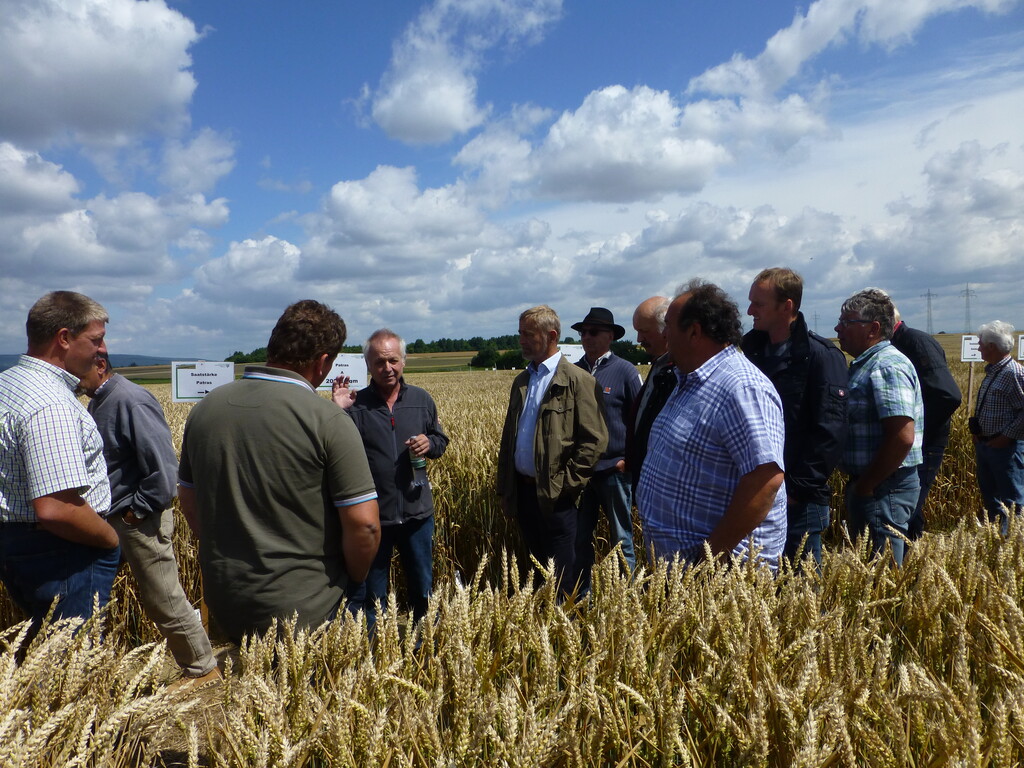 Los ging es mit einer Führung auf dem Versuchsfeld des Frankfurter Landwirtschaftlichen Vereins e.V. in Bad-Homburg Ober-Erlenbach, wo Georg Kopp den schwäbischen Gästen in der Maschinenhalle bei Kaffee und Kuchen die Besonderheiten der Arbeit auf dem Versuchsfeld erläuterte. Daran anschließend ging es nach draußen, um sich die verschiedenen Versuchsvarianten direkt vor Ort anzuschauen.