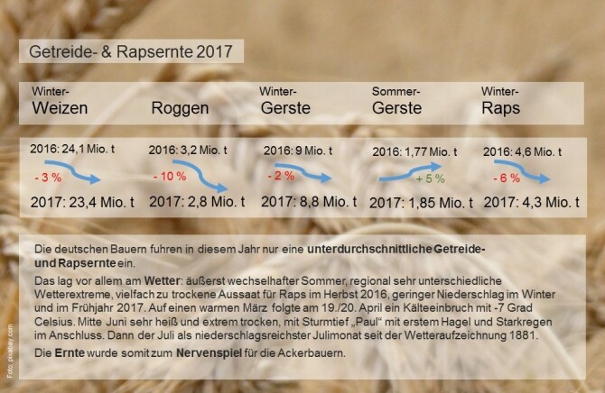 Die Anbaufläche von Winterraps zur Ernte 2017 betrug 1,31 Millionen Hektar. Der Witterungsverlauf hat die Erträge deutlich gemindert. Trockenheit nach der Aussaat hat die Bestände schlecht auflaufen lassen, was vielfach zu Lücken führte. Zudem trafen die Frostnächte im April den Raps in der Blüte. Ein erhöhter Krankheits- und Schädlingsdruck sowie die Hitzewelle im Juni verringerten das Ertragspotenzial weiter. Abschließend verhinderten die regenbedingten Ernteunterbrechungen ein fristgerechtes Einbringen der Rapsernte, so dass es selbst beim Raps zu Auswuchs kam.