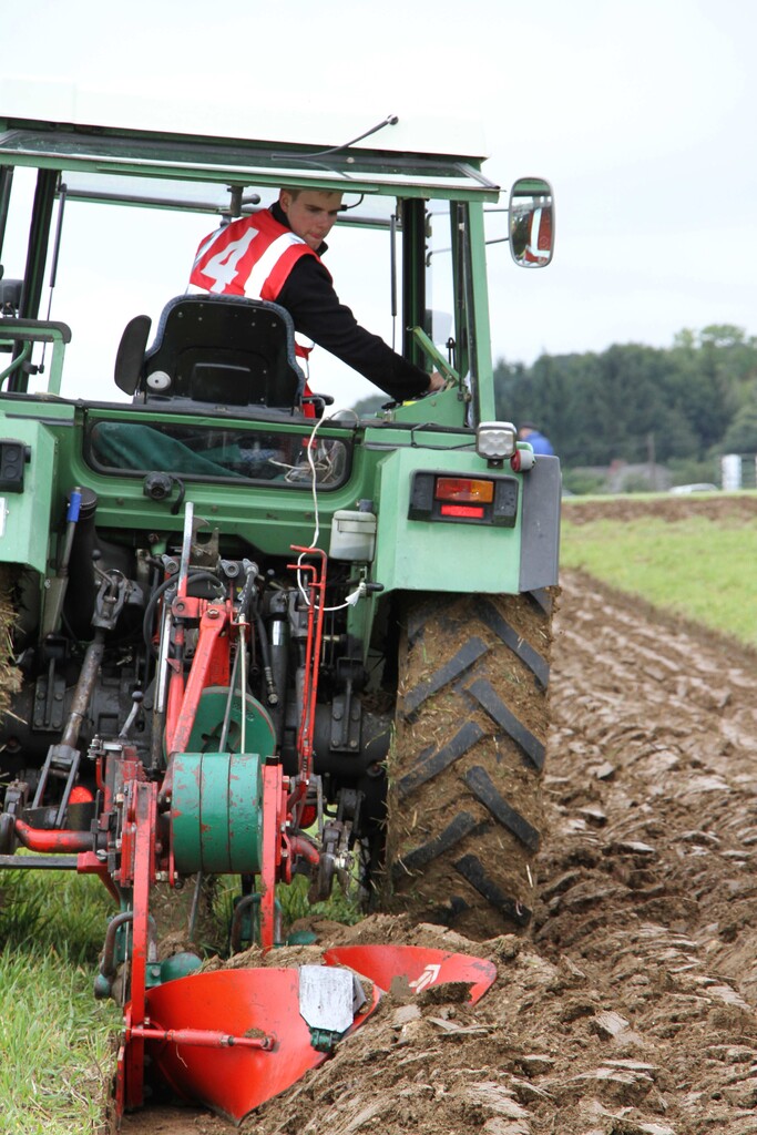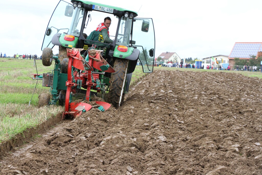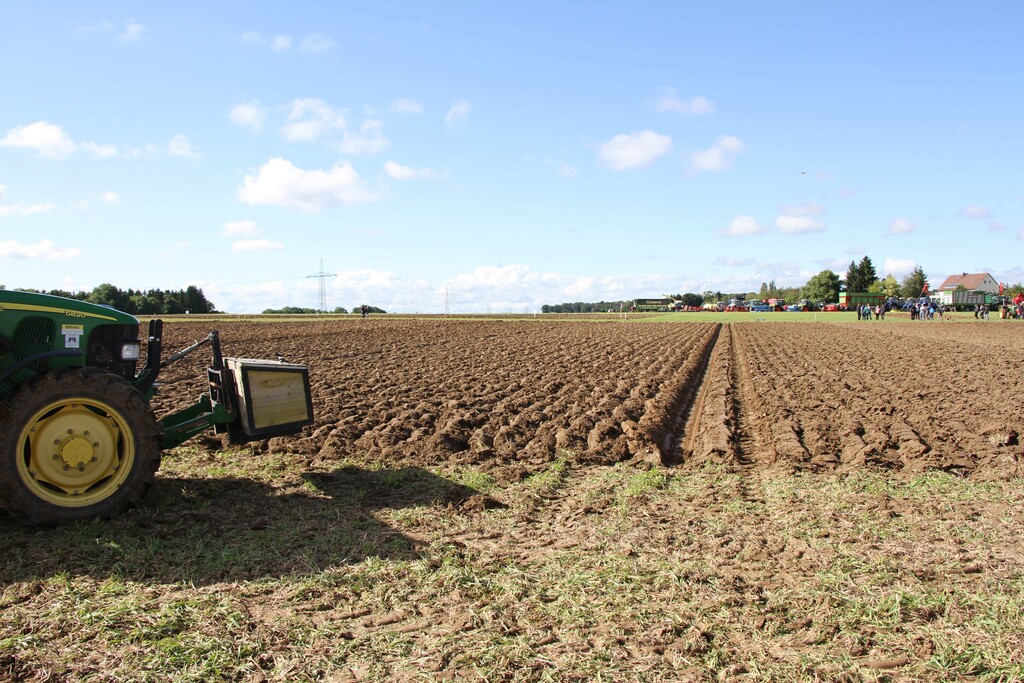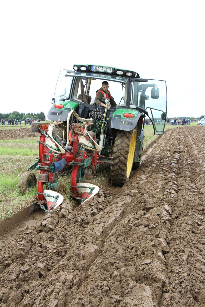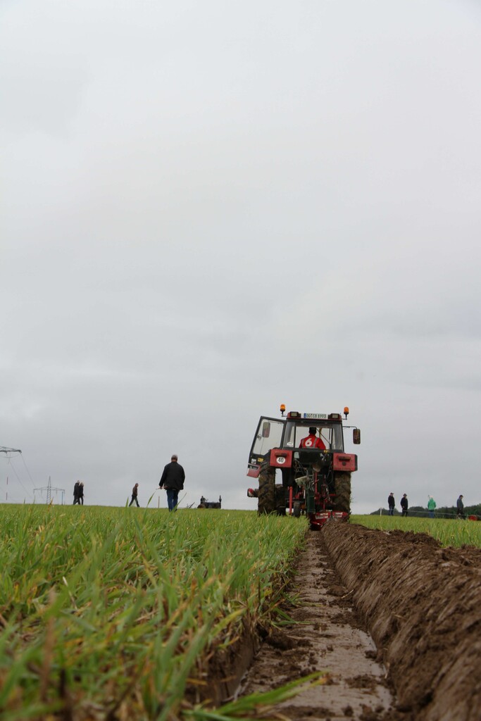 Bei tiefhängenden Wolken ging es in einer Schlepperparade, an welcher alle 28 Starter des Kreis- und Landesentscheides als auch des Oldtimerpflügens teilnahmen, hinaus aufs Wettkampffeld. Dem Regen näher als dem Sonnenschein steckten die Pflüger ihre Parzellen aus und zogen ihre Spaltfurche. Nach und nach besserten sich die Wetterverhältnisse, der Boden trocknete weiter ab, sodass zum Ende des Wettbewerbs die Schlussfurche bei strahlend blauem Himmel und guten Bedingungen gezogen wurde.