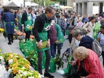 An diesem sonnigen Samstagmorgen dürfen sich nicht nur Erzeuger und Verbraucher freuen, sondern auch Bedürftige. Denn die Marktbeschicker mit ihrem Sprecher Henk van der Geer vornedran spenden ihre wohlschmeckenden und -riechenden Erzeugnisse den kirchlichen Hilfswerken ‚Misereor‘ und ‚Brot für die Welt‘.