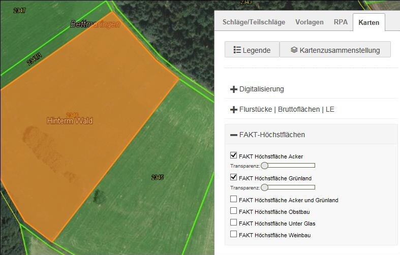 Um die Landwirte bei der Antragstellung 2018 in FIONA weiter zu unterstützen, werden ergänzende Layer für FAKT-Maßnahmen eingeführt. Diese enthalten entsprechend den EU-Vorgaben beihilfefähige Höchstflächen für die einzelnen FAKT-Maßnahmen und zeigen jeweils die Gesamtfläche auf, für die je Flurstück FAKT-Maßnahmen beantragt werden können.