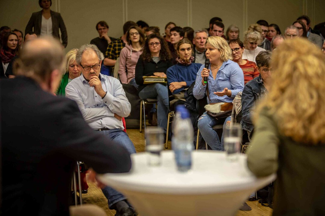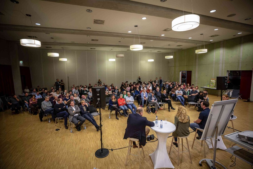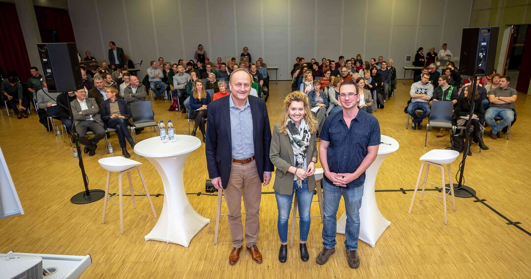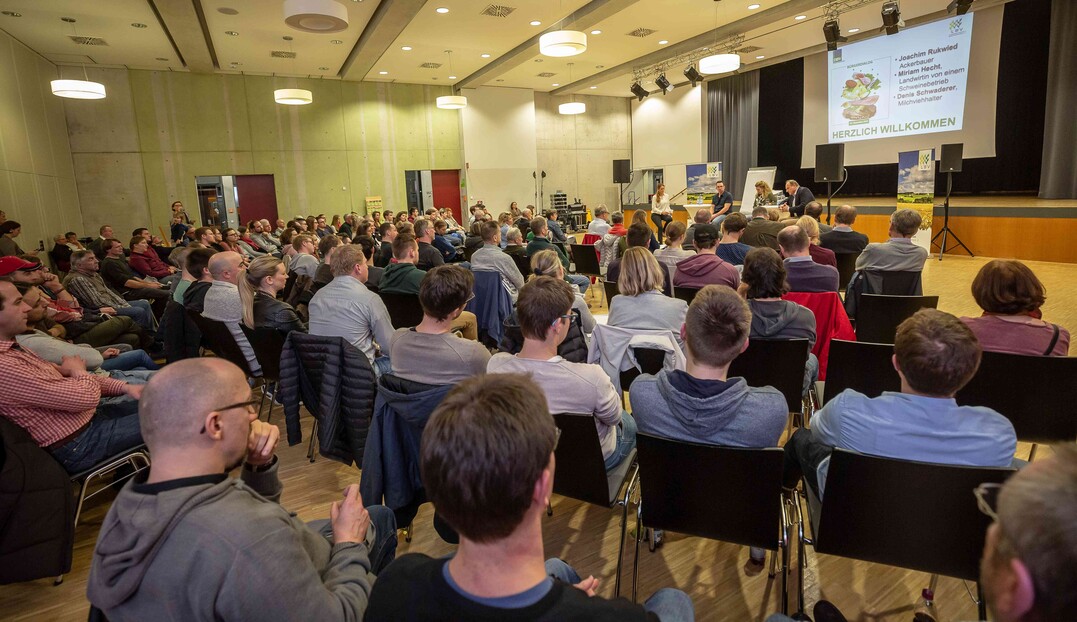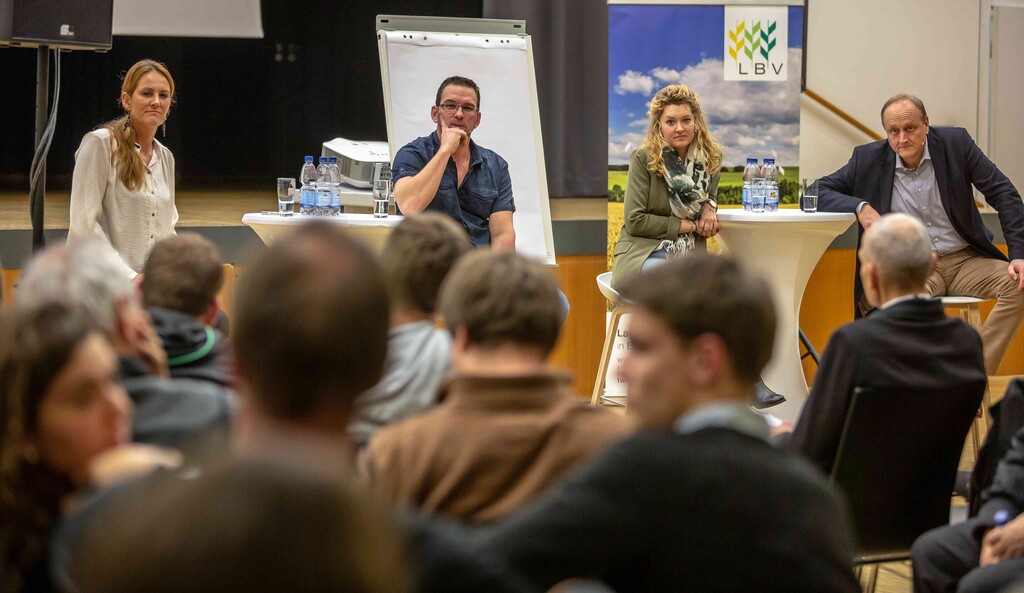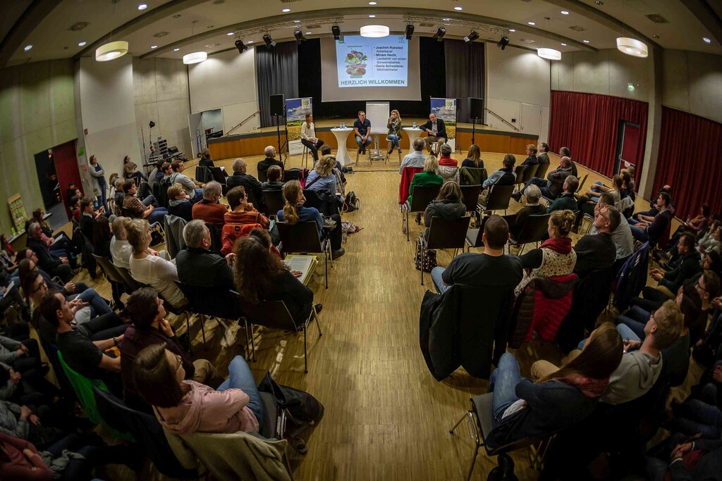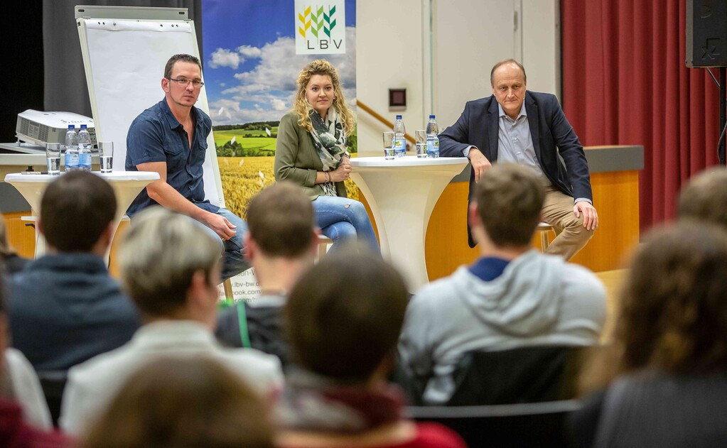 Beim ersten Bürgerdialog am Montag stellten sich Miriam Hecht (Schweinehalterin aus Sulmingen, Kreis Biberach), Denis Schwaderer (Milchviehhalter im Stiftsgrundhof, Rems-Murr-Kreis) und DBV- sowie LBV-Präsident Joachim Rukwied den Fragen der rund 150 anwesenden Verbraucher. Alle drei sind leidenschaftliche Landwirte, die auf ihren Betrieben die Öffentlichkeitsarbeit fest integriert haben.