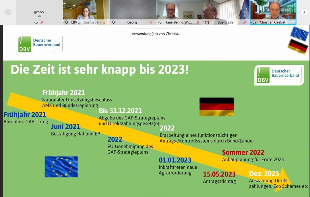 Die Zeit drängt. Daran ließen nach Norbert Lins auch die beiden anderen Referenten des Nachmittags, Christian Gaebel, Referatsleiter Gemeinsame Agrarpolitik beim Deutschen Bauernverband, und Brigitte Beyer, Leiterin Referat Grundsatz Agrarpolitik im Bundesministerium für Ernährung und Landwirtschaft, keinen Zweifel. Damit die Landwirte im Sommer 2022 die Anbauplanung für Jahr 2023 nach den neuen Vorgaben erstellen können, muss der Nationale Strategieplan als zentrales Instrument zur Umsetzung bis zum 1. Januar 2022 bei der EU-Kommission eingereicht sein und im Anschluss ein funktionsfähiges Antrags- und Kontrollsystem in den Bundesländern aufgebaut werden.