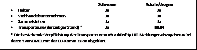 Bisher waren Halter von Schweinen, Schafen oder Ziegen zur Abgabe einer Stichtagsmeldung über den am 1. Januar vorhandenen Bestand bis spätestens 15. Januar des laufenden Jahres sowie bei der Übernahme von Tieren zu Zugangsmeldungen innerhalb von sieben Tagen verpflichtet.