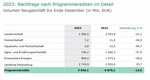 Die Investitionszurückhaltung der Branche spiegelt sich auch im Fördergeschäft der Rentenbank wider. Das Förderneugeschäft mit zinsgünstigen Programmkrediten ging über alle Sparten hinweg um 13,6 % auf 5,9 Mrd. Euro zurück (2022: 6,9 Mrd. Euro). Den volumenmäßig stärksten Rückgang verzeichneten die Fördersparten „Landwirtschaft“, „Erneuerbare Energien“ sowie „Agrar- und Ernährungswirtschaft“. Hier wirkten sich vor allem ausbleibende Investitionen in Wirtschaftsgebäude und Maschinen sowie die rückläufige Nachfrage nach Windkraftfinanzierungen dämpfend aus. Dagegen konnte das Neugeschäft in der Fördersparte „Ländliche Entwicklung“ aufgrund der hohen Nachfrage der Landesförderinstitute nach Globaldarlehen der Rentenbank erneut gesteigert werden.
