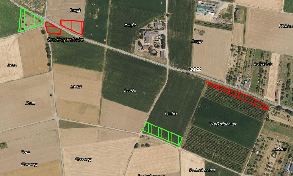 Das Flächenmonitoringsystem überprüft für jeden Teilschlag anhand der Satellitendatenauswertung, ob der in FIONA angegebene Nutzcode mit der tatsächlichen Bewirtschaftung des Teilschlages übereinstimmt und ob die jeweiligen Bewirtschaftungsauflagen auf dem Teilschlag eingehalten wurden. Bei Teilschlägen, die rot markiert sind, konnte das System die Antragsangaben nicht bestätigen. Sollte die tatsächliche Nutzung und Bewirtschaftung des Teilschlags von den Angaben in FIONA abweichen, so sind die Antragsdaten in FIONA zu ändern und der Gemeinsame Antrag in FIONA erneut bis zum 30. September einzureichen, damit die Änderungen der Verwaltung bekannt werden.