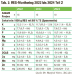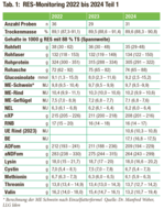 Der Lysingehalt lag im Jahr 2024 mit 18,0 Gramm (g) pro kg etwas niedriger als im Jahr 2023 und erreichte wieder das Niveau des Jahres 2022. Bei der Untersuchung auf Mengen- und Spurenelemente zeigte sich auch im Jahr 2024, dass die Tabellenwerte in etwa erreicht wurden (Tabelle 2). Der besonders interessante Phosphorgehalt lag in diesem Jahr mit 10,7 g pro kg RES leicht über dem Mittelwert der vorangegangenen Jahre. Man erkennt eine Streuung der Werte, die Abweichungen von rund 20 % nach oben und unten ausweisen. Da man dabei aber noch im Bereich des Analysenfehlers bleibt, kann man von einer niedrigen Streuung sprechen.