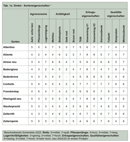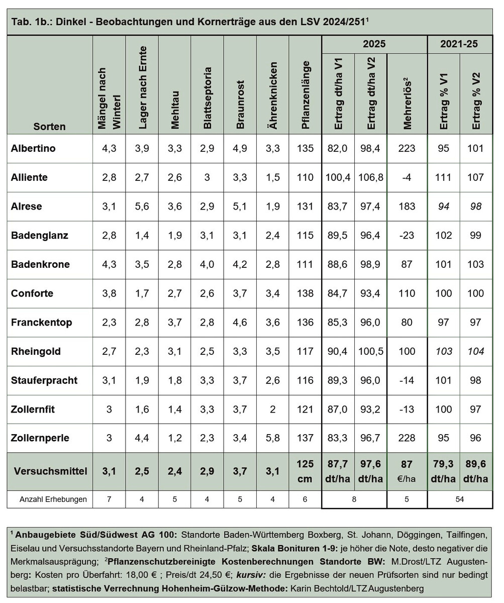 Zur Ernte 2025 standen 11 Sorten in Baden-Württemberg zur Prüfung an, davon zwei Neuzulassungen – Rheingold und Alrese. Insgesamt wurde über 8 Standorte verrechnet, einschließlich der bayerischen und rheinland-pfälzischen Dinkelversuche. Die Landessortenversuche-Dinkel werden zweifaktoriell angelegt, das heißt, in der integrierten Variante (V2) kommen Fungizide und Wachstumsregler zum Einsatz, in der reduzierten Variante (V1) wird auf diese Pflanzenschutzmaßnahmen verzichtet.
