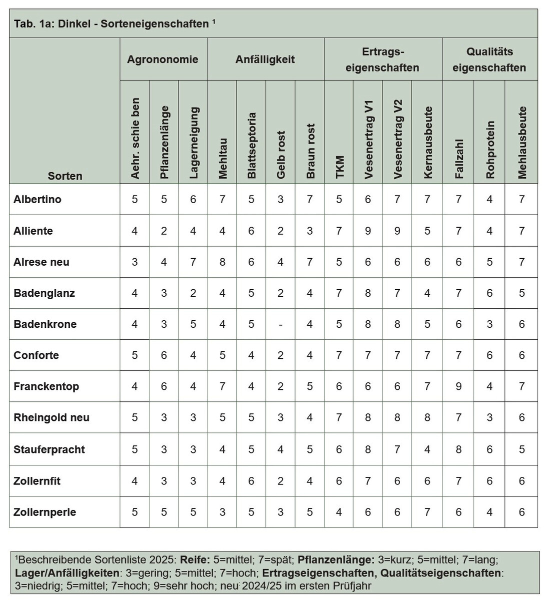 Zollernperle ist im Ertrag 2025 und mehrjährig die schwächste Prüfkandidatin. 2025 präsentiert sich der Dinkel trotz mittlerer Einstufung bei Braunrost und Septoria überdurchschnittlich unempfindlich und blattgesund. Schwachpunkt der sehr langstrohigen Sorte ist die unzureichende Stroh- und Ährenstabilität. Bei den Qualitäten ist die Kernausbeute laut BSL positiv hervorzuheben, dagegen sind die Fallzahlen eher schwach.