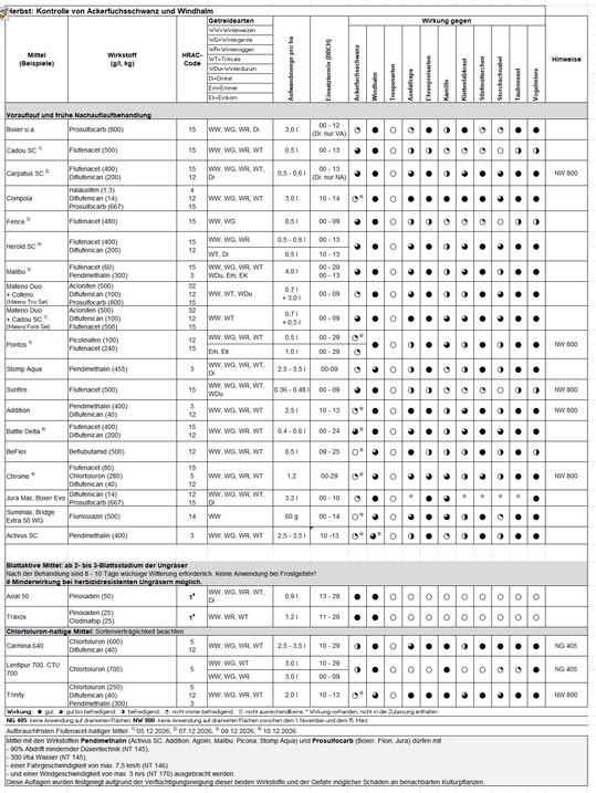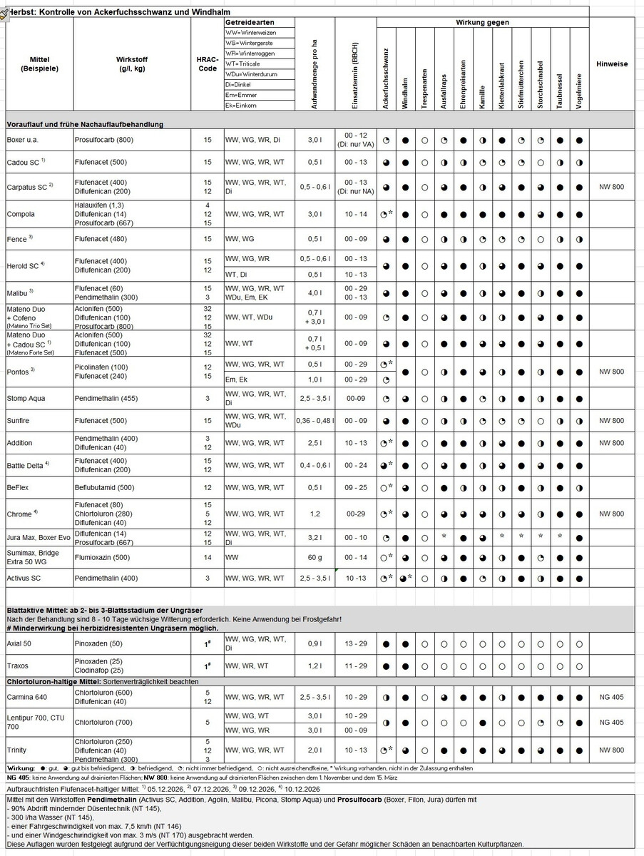 Der Windhalm lässt sich im Herbst mit einer Vielzahl von Wirkstoffen im Vor- bis frühen Nachauflauf sicher regulieren. Die Herbizide sind in der Tabelle aufgeführt. Auch hier gilt zur Resistenzvermeidung, dass Herbstbehandlungen mit Bodenherbiziden gegen Windhalm wirkungssicherer als Frühjahrsbehandlungen sind.