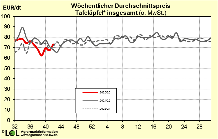 von Alexander Kreisel, LEL Schwäbisch Gmünd Quelle LEL erschienen am 22.10.2025Der vermehrte Regen der letzten Wochen und Monate kam dem Größenwachstum dennoch zu Gute, weshalb die diesjährige Ernte am Ende wohl auch am Bodensee etwas höher ausfallen wird als geschätzt. Bedeutende Übermengen sind aber nicht zu erwarten. Aufgrund guter Qualitäten floss bis jetzt zudem weniger Ware in die Verarbeitung ( 38,6 % ggü. Vj. laut vorläufiger Marktstatistik), was die Lager zusätzlich füllte. Auf welchem Niveau sich die diesjährigen Vorräte letzten Endes aber bewegen, bleibt abzuwarten, was momentan noch für Unsicherheit sorgt.