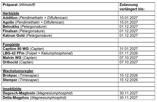 Zulassungsverlängerungen von Pflanzenschutzmitteln
