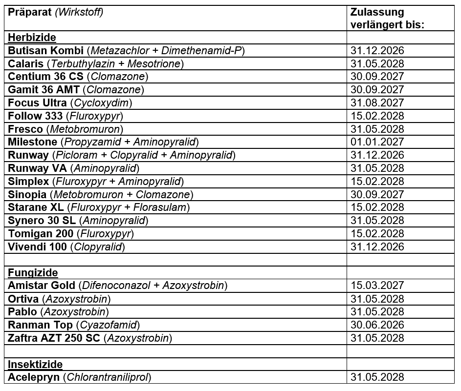 von Dr. Jonathan Mühleisen, Pflanzenschutzdienst am Regierungspräsidium Stuttgart erschienen am 17.11.2025Das Bundesamt für Verbraucherschutz und Lebensmittelsicherheit hat die Zulassung von Pflanzenschutzmitteln, deren Zulassung durch Zeitablauf endete, verlängert. Die Zulassungsverlängerungen werden bis zur endgültigen Entscheidung über eine erneute Zulassung erteilt.