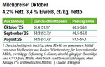 Für den Monat Oktober ging der durchschnittliche BWagrar-Monatspreis für konventionelle GVO-freie Kuhmilch gegenüber September im gewichteten Mittel deutlich um 1,9 Cent zurück. Der Biopreis blieb mit 66,5 Cent im gewichteten Durchschnitt unverändert beziehungsweise hat sich um 0,1 Cent pro kg gegenüber dem Vormonat erhöht.