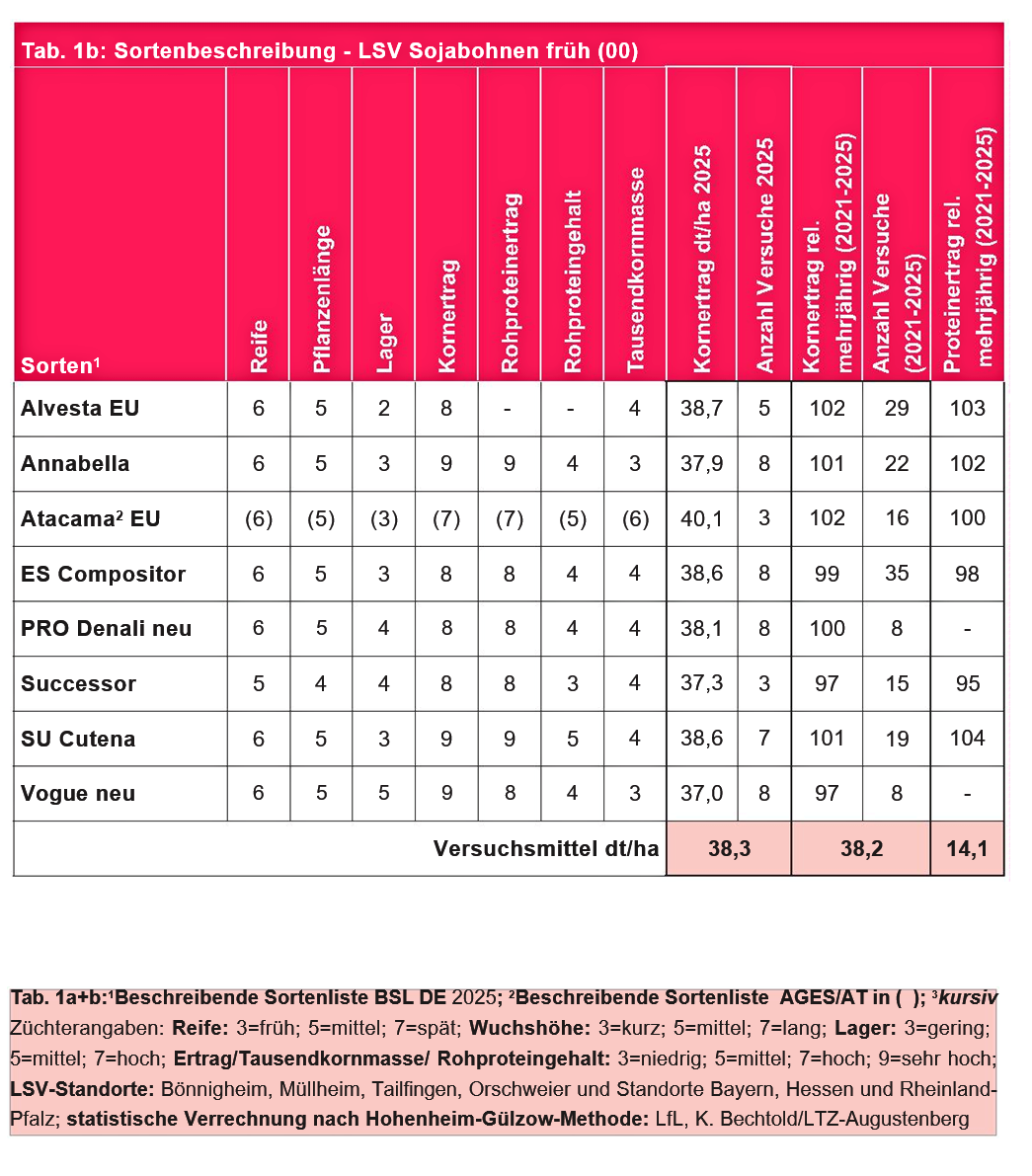Die Landessortenversuche (LSV) Sojabohnen werden als reine Sortenprüfungen nach den Reifegruppen sehr früh (000) und früh (00), getrennt und vierfach wiederholt, angelegt und mit den Versuchen der angrenzenden Bundesländer Bayern, Hessen und Rheinland-Pfalz ein- und mehrjährig verrechnet.
