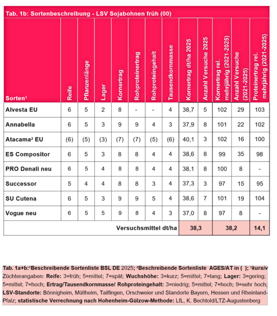 Der Durchschnittsertrag der sehr frühen Sojabohnen (000) lag, verrechnet über 8 Standorte und 16 Prüfglieder, bei 38,5 dt/ha und einer Trockensubstanz (TS) von 87 Prozent. Den höchsten Ertrag verzeichnete der bayerische Standort Oberhummel mit 52 dt/ha, dicht gefolgt von Orschweier (Baden-Württemberg) mit 51 dt/ha. Ertragsstärkste Sorte war die EU-Sorte Ascada mit 109 Prozent Relativertrag.