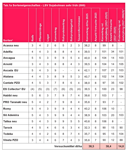 Die EU-Sorte Ascada erzielt 2025 und mehrjährig Spitzenleistungen im Kornertrag. Entsprechend hoch ist auch der Proteinertrag. Bei Standfestigkeit und Reifeverzögerung ist die Sorte leicht schwächer einzuschätzen. Ascada reift etwas später ab als der Durchschnitt.