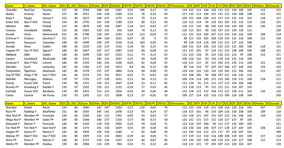Bei den töchtergeprüften Vererbern verlieren Gywer RDC-Blutführungen an früherer Dominanz. Die Spitzenplätze besetzen Precision (RZG 148) und Mask Red (RZG 146) – beides Bullen der Phönix Group. Beachtenswert ist die Platzierung von Cohen RDC (RZG 139), gezogen von Jürgen Fleig in Nordstetten. Die starken Einsatzleistungen seiner ersten Töchter katapultieren den Chilton-Sohn auf Rang 22 der schwarzbunten Topliste. Aufgrund seiner knapperen Melkbarkeit wird der Rotfaktorträger voraussichtlich nicht in den Wiedereinsatz kommen – dokumentiert aber das genetische Potenzial der Holsteinzucht in Baden-Württemberg.
