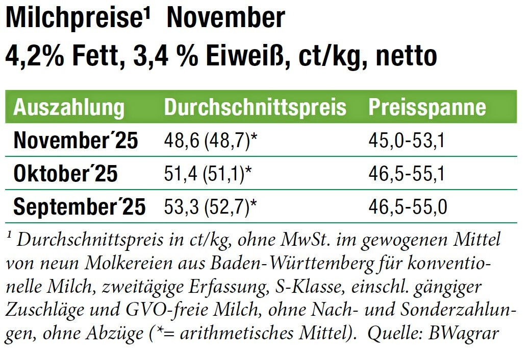 von Matthias Borlinghaus erschienen am 17.12.2025Nachdem der BWagrar Milchpreis bereits im September um minus 0,2 Cent und im Oktober um minus 1,9 Cent zurückging, mussten die Milcherzeuger im November mit im Schnitt 2,8 Cent pro kg eine weitere deutliche Preissenkung hinnehmen. Für Dezember werden bei der konventionellen Milch nochmals Preissenkungen erwartet. Dass die Milchpreise seit September in einem vergleichsweise kurzen Zeitraum so stark fallen, überrascht selbst langjährige Marktbeobachter, die noch im Sommer mit einer stabilen Marktentwicklung bis Jahresende gerechnet hatten. Wie stark der Rückgang ist, zeigt der Blick auf den Kieler Rohstoffwert. Der ist im November auf 35,7 Cent gefallen, dabei lag er noch im Sommer bei rund 48 Cent. Das ist ein Rückgang um deutlich über zehn Cent innerhalb von drei bis vier Monaten. Gegenüber dem Vorjahreswert im November 2024 sind es sogar 20 Cent weniger.