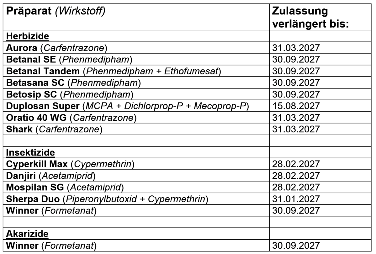 Das Bundesamt für Verbraucherschutz und Lebensmittelsicherheit hat die Zulassung von Pflanzenschutzmitteln, deren Zulassung durch Zeitablauf endete, verlängert.