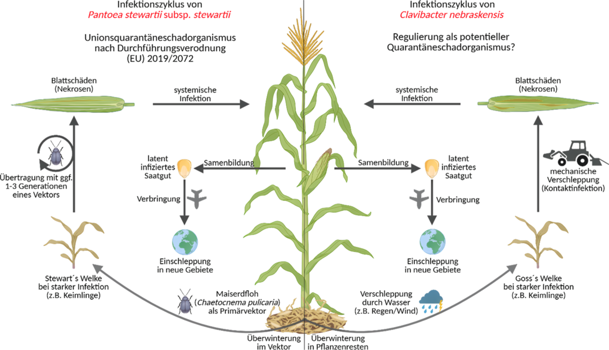 Zwei bakterielle Krankheiten, die aus den USA kommen, werden pflanzengesundheitlich überwacht. Wie groß ist das Schadpotenzial in Deutschland? Woran lässt sich der Befall erkennen? Und fungiert ein Insekt als Vektor? Die Stewarts Bakterienwelke wird verursacht durch Pantoea stewartii subspecies stewartii, die Goss Bakterienwelke durch Clavibacter nebraskensis. Beide Krankheiten haben eine lange Geschichte im Maisanbau in den USA und bergen das Risiko für eine Einschleppung über das Saatgut und die Ansiedlung und Ausbreitung in Europa.