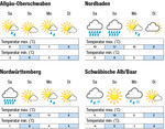 Am Samstag bringt starker, in Hochlagen stürmischer Wind aus Westen, Wolken und Regen. Die Schneegrenze steigt von anfänglich 1000 Meter bis über 1500 Meter Höhe. Die Temperaturen erreichen 8°C im Rheintal und im mittleren Neckarraum, 6°C am Bodensee sowie 3°C auf der Alb und steigen im Verlauf der Nacht weiter. Am Sonntag ziehen die Schauer ab, der Wind hält an, die Bewölkung lockert sich rasch bei maximal 14°C in den Ebenen und 8°C auf der Alb. Zum Montag folgen weitere Wolken und Schauer. Die Schneefallgrenze sinkt auf 500 Meter bei abnehmendem Westwind, nachmittags 7°C in den Ebenen und 2°C auf der Alb. Am Dienstag bringt mäßiger Westwind Aufhellungen und Temperaturen bis 8°C in den Ebenen und 2°C auf der Alb, nachts gibt es Frost...