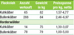 Zu einem Rekordauftrieb von 440 Kälbern kam es bei der RBW-Kälberauktion am 11. Februar. Bei sehr starker Nachfrage stiegen die Preise in allen Kategorien. Die acht Vorderwälder-Kuhkälber wechselten flott ihre Besitzer und erzielten einen Durchschnittspreis von 153 Euro. Die 65 Fleckvieh-Kuhkälber kamen auf 274 Euro bei 82 kg Gewicht. Dies ergibt einen Kilopreis von 3,33 Euro. Am gefragtesten waren eine Mint-Tochter aus dem Betrieb Ewald in Bräunlingen und eine Manuap-Tochter von der Rogg GbR in Stühlingen-Bettmaringen. Die 78 Vorderwälder-Bullenkälber steigerten den Kilopreis leicht auf 3,53 Euro. Je Kalb mit im Schnitt 79 kg Gewicht wurde netto 279 Euro angelegt. Besonders heftig gesteigert wurde bei den 288 Fleckvieh-Bullenkälbern....