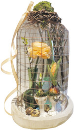 Material: Kupfermaschendraht von der Rolle, Bindedraht, kupfer lackiert, dickerer Aludraht (kupferfarben, etwa zwei Millimeter Durchmesser), Seitenschneider, Handschuhe (für empfindliche Hände), Blumen und Pflanzen, Vasen und Becherchen zum Befüllen der Glocke Und so wird‘s gemacht: Zuerst wird ein Drahtstück mit einer Länge von etwa 60 Zentimeter Länge abgeschnitten. Dieses wird zu einem Schlauch in gewünschtem Umfang so zusammengerollt, dass Anfang und Ende etwas überlappen. Mit einem Stück Wickeldraht wird der Tunnel zugenäht. Überstehende Drahtspitzen nach innen drücken, damit man sich nicht verletzt. Am unteren Ende des Tunnels wird rundum dickerer Aludraht mit Bindedraht vernäht. So erhält der Glockenboden eine bessere Stabilität....