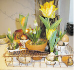 Material: Hasendraht oder Kupferdraht von der Rolle, Seitenschneider, Bindedraht in Kupfer, Perlen, Tragehölzer für Pakete, Zwiebelblumen mit Wurzeln in Tontöpfchen und Eierbechern sowie weiteres Dekomaterial als Inhalt Und so wird‘s gemacht: Hierzu wird ein Stück Draht von etwa einem Meter Länge abgeschnitten. Diesen in der Mitte exakt so falten, dass die Quadrate schön übereinander liegen. Auf diese Weise erhalten wir einen doppelten Boden mit mehr Stabilität. Zur leichteren Weiterverarbeitung empfiehlt es sich, die zwei Lagen mit einem dünnen Bindedraht in Kupfer zusammenzunähen. Danach wird an allen vier Ecken zwei Quadrate weit mit dem Seitenschneider eingeschnitten. Es fällt an jeder Ecke ein Drahtstück weg. So können die...