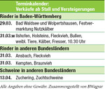 Braunvieh: Als Körsieger ging am 9. März ein Huvi-Sohn aus dem Betrieb Jürgen Held, Donaustetten hervor. Er stammte aus einer Huray-Bullenmutter mit über 12.000 kg. An der Spitze der Jungkühe stand eine Huronto-Tochter mit 31,6 kg Milch. Sie wurde von Arthur Ulrich, Essingen, vorgestellt und erlöste 1700 Euro. Mit dem höchsten Marktgemelk von 38,7 kg Milch wartete eine Juleng-Tochter von Dietmar Reisch, Arlach, auf. Sie stand in der Käufergunst ganz oben. Martin Hänsler, Wangen stellte eine tolle Payssli-Tochter vor. Die Kuhkälber hielten ihren Preis. Fleckvieh: Körsieger bei den Bullen wurde ein Hutera-Sohn aus einer Rentar-Mutter mit einer Lebensleistung von über 80.000 kg. Vorgestellt wurde der Bulle vom Betrieb Alois Müller,...