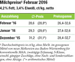 Im Februar 2016 ist der gewogene BWagrar-Durchschnittspreis gegenüber Januar 2016 um 0,7 Cent von 29,3 Cent auf 28,6 Cent pro kg weiter zurückgegangen. Im arithmetischen Mittel fiel er auf 28,8 Cent (siehe Tabelle). Die Lage am Milchmarkt ist damit weiterhin äußerst angespannt, wobei das Preisniveau in Süddeutschland noch deutlich stabiler ist als im Norden und Osten der Republik. Hier liegen die Auszahlungspreise im Februar teilweise bei nur noch 22 bis 23 Cent. Hauptgrundisteine europaweite zu hohe Milchanlieferung, die trotz schwacher Preise weiter gestiegen ist – am stärksten in Irland und in Holland.Verglichen mit den Preisen von vor zwei Jahren sind die Notierungen an den Produktmärkten bei Käse um rund 60 Prozent eingebrochen. Bei...