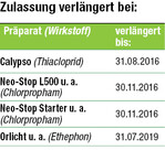 Das Bundesamt für Verbraucherschutz und Lebensmittelsicherheit hat die Zulassung von Pflanzenschutzmitteln, deren Zulassung durch Zeitablauf endete, verlängert. Diese Zulassungsverlängerungen werden bis zur endgültigen Entscheidung über eine erneute Zulassung erteilt. Dies betrifft folgende Mittel: