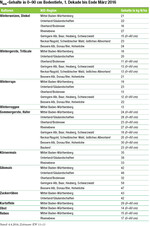 Für die Winterungen lagen die Werte bei einer Bodentiefe von 0–90 cm bei 21 kg N/ha. Unter den geplanten oder bereits gesäten Sommerungen (ohne Mais) wurde ein durchschnittlicher Nmin-Gehalt von 28 kg N/ha in einer Bodentiefe von 0–60 cm ermittelt, verteilt auf jeweils 14 kg N/ha pro Schicht. Die Verteilung des Nitratstickstoffs in den einzelnen Schichten beträgt bei Winterungen 8 – 7 – 6 kg N/ha. Der Nitrat-N-Gehalt für Körnermais liegt bei 35 kg N/ha, für Silomais sind es 42 kg N/ha in einer Bodentiefe von jeweils 0–90 cm. Für Standorte, die eine durchwurzelbare Bodentiefe von mehr als 60 cm aufweisen, aber nur auf zwei Schichten beprobt wurden, sollten für die 3. Schicht folgende Werte zusätzlich angerechnet werden: Winterweizen/Dinkel...