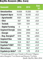Die BayWa AG, München, steigerte 2015 das Ergebnis vor Steuern und Zinsen (EBIT) auf 158,1 (Vorjahr: 152,1) Mio. Euro. Das ist im zweiten schwierigen Agrarjahr in Folge ein Plus um 3,9 Prozent. Die Rohstoffpreise fielen auf Mehrjahrestief. So sank der Umsatz preisbedingt um 1,8 Prozent auf 14,9 (Vorjahr: 15,2) Mrd. Euro.