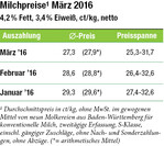 Der Markt für Milch wird derzeit heftig durcheinander gewirbelt. Die Preise befinden sich weiterhin im Sinkflug. Das führt zu einer großen Verunsicherung bei Erzeugern und Molkereien. Der gewogene BWagrar-Durchschnittspreis ist im März gegenüber Februar um 1,3 Cent von 28,6 Cent auf 27,3 Cent pro kg weiter deutlich zurückgegangen. Im arithmetischen Mittel fiel er auf 27,9 Cent (siehe Tabelle). Die große Spanne in den Auszahlungspreisen zwischen 25,3 Cent und 31,7 Cent pro kg von über sechs Cent sorgt für Unzufriedenheit bei den Erzeugern. Da ist die Gefahr groß, dass die Rufe nach Kündigungen auf der einen Seite und Aufnahmestopps auf der anderen Seite lauter werden. Auch der Kieler Rohstoffwert fiel im März um 2,3 Cent auf 19,8 Cent. Das...