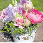 Material: alte Tasse, Steckmasse oder Schwamm, Grün zum Abdecken, Blumen Und so wird‘s gemacht: Meist hat man noch ein altes Erbstück mit Aufschrift im Schrank, ansonsten kann jede schöne Tasse verwendet werden: Sie wird mit einem kleinen Stück gewässerten Schwamm gefüllt und mit Grün wie Efeu oder Pachysandra (im Volksmund „Dickmännchen" genannt) abgedeckt. Beim Arrangieren des kleinen Gesteckes darauf achten, dass flächige, schwere Blüten tiefer in die Basis (also näher zum Schwamm) und leichte, luftige Blüten, wie beispielsweise Wicken, so darüber gesteckt werden, dass es aussieht, als würden sie schweben. Bei der Auswahl der Blüten kann jeder seine Botschaft beachten – beispielsweise eine Pfingstrose als Zeichen für Schönheit, Fülle,...
