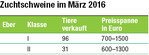 Im März stabilisierte sich das Preisniveau bei der Vermarktung von Schlachtschweinen und Ferkeln ein wenig. Diese leicht bessere Stimmung zeigte sich auch im Ebermarkt. Die beste Nachfrage seit Jahresanfang verbesserte die Verkaufszahlen der Eberzüchter in Baden-Württemberg für das erste Quartal deutlich. Im März wurde eine größere Stückzahl von Jungebern verzeichnet, da etliche Bestellungen noch abgewickelt wurden. Ingesamt wurden nahezu 130 Jungeber verkauft. Mit mehr als 90 Tieren der Klasse I boten die Piétrain-Zuchtbetriebe vortreffliche Qualität an. Fast alle Tiere hatten die Typisierung durchlaufen und waren deshalb bei der Besamung begehrt. Auch Exporte nach Spanien, Rumänien und Verkäufe in andere Bundesländer begünstigten die...