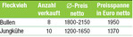 Bei der RBW-Großviehauktion am 4. Mai wurden die acht Bullen und zehn Jungkühe komplett verkauft. Die Bullen waren von hervorragender Qualität. Die Kollektion wurde angeführt von drei Bullen aus dem Betrieb Berger, Herbertingen-Mieterkingen. Den Tageshöchstpreis von 2150 Euro erzielte ein Windstone-Sohn aus einer Ermut-Tochter mit 11.500 kg Leistung. Die beiden anderen, ein Hutera-Sohn und ein Voltaire-Sohn, wechselten für 2000 Euro den Besitzer. Die Jungkühe kamen auf 1370 Euro. 1650 Euro erzielte eine genetisch hornlose Grimm-Tochter von Thomas Burger aus Biederbach.