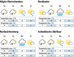 Der Samstag beginnt mit Schauern und örtlichen Gewittern bei milden Temperaturen um 15°C. Gegen Nachmittag lassen die Schauer nach, es bleibt jedoch meist bewölkt bei Temperaturen bis 20°C auf der Alb und 25°C im Rheintal. Der Sonntag wird wechselhaft mit Schauern und lokalen Gewittern, die Temperaturen erreichen noch 15°C in den Hochlagen des Schwarzwaldes, 21°C am Bodensee und 23°C am unteren Neckar. Zunehmender Südwestwind bringt am Montag Wolken mit Niederschlägen und Temperaturen bis 15°C auf der Alb und bis 19°C in den Ebenen. Am Dienstag lassen die Niederschläge nach bei maximal 19°C in den Ebenen. Im weiteren Wochenverlauf bleibt das Wetter wechselhaft bei Maxima um 20°C. | →Das detaillierte Agrarwetter mit allen Infos...