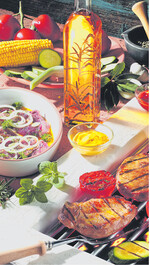 4 Schweinenackensteaks 4 Schweinekoteletts 1 Zwiebel 1 Knoblauchzehe 250 ml Rapsöl fein gehackte Petersilie Rosmarin 2 Kolben Zuckermais 4 Grilltomaten 2 Zucchini Salz, Pfeffer Salbeiblätter