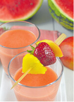für zwei Gläser á 250 ml: je 120 g Wassermelone, Ananas und Mango 130 g Erdbeeren 2 Erdbeeren mit Stielen und 2 Ananas- und Mangostücke; 2 Holzspieße