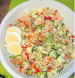 200 g Couscousgrieß 4 Esslöffel Zitronensaft 375 ml Buttermilch oder Brühe 5 Esslöffel Öl Salz, Pfeffer, 1 Knoblauchzehe 1 Bund Petersilie, Koriandergrün 300 g Zucchini, 1 rote Paprika 300 g Fleischtomaten 1 Bund Frühlingszwiebel 200 g Käse (Feta, Gouda)