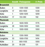 Bei der Zuchtviehversteigerung der Rinderunion Baden-Württemberg (RBW) am 18. Juli 2016 in Bad Waldsee wurden folgende Ergebnisse erzielt: Braunvieh: Ein interessanter genomisch untersuchter Himalaya-Sohn stand an der Spitze der Braunviehbullen. Mit 124 im Euter und 114 im Fundament konnte er genomische Spitzenwerte im Exterieur vorweisen. Auch die Leistungsvererbung mit 923 kg Milch machte das Tier zu einem ganz kompletten Bullen. Sehr gut war die Qualität der Braunviehjungkühe. Eine breite Spitze ließ einen flotten Marktverlauf zu. Aus der Kollektion heraus stachen eine Payssli-Tochter vom Landwirtschaftlichen Zentrum in Aulendorf (LAZBW), die bei bestem Exterieur 35,3 kg Milch leistete und für 1800 Euro verkauft wurde. Mit einem...