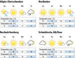 Der Samstag beginnt gebietsweise mit Frühnebel. Tagsüber wird es sonnig mit Quellwolken bei Wind aus zunehmend nördlicher Richtung und Temperaturen bis 25°C in den Ebenen, 19°C auf der Alb und 12°C im Hochschwarzwald. Am Sonntag steigen die Temperaturen weiter bis auf 27°C im Rheintal, 22°C auf der Alb und 15°C im Hochschwarzwald bei überwiegend wolkenlosem Himmel. In Hochlagen ist frischer Wind aus östlicher Richtung spürbar. Am Montag bleibt die Witterung unverändert bei abnehmendem Ostwind. Am Dienstag ziehen neue Wolken auf, die für Gewitter und lokale Schauer sorgen, die Maxima erreichen noch bis zu 27°C am Rhein und 22°C auf der Alb. Die folgenden Tage werden wechselhaft und kühler. | →Das detaillierte Agrarwetter, speziell...
