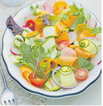 2 – 3 Möhren 2 – 3 Zucchini 200 g Cocktailtomaten 1 Bund Radieschen 1 rote Zwiebel 2 Hand voll Salat (Lollo Rosso, Batavia, Eichblatt etc.) 3 EL Weißweinessig 3 EL Zitronensaft 1 TL mittelscharfer Senf 1 TL flüssiger Honig 1 EL gehackte Petersilie Salz, Pfeffer, aus der Mühle 5 EL Olivenöl
