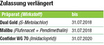 Das Bundesamt für Verbraucherschutz und Lebensmittelsicherheit (BVL) hat die Zulassung folgender Pflanzenschutzmittel, deren Zulassung durch Zeitablauf endete, verlängert. Die für den Acker-, Obst-, Gemüse- und Weinbau bedeutsamen Mittel sind in der Tabelle zusammengestellt.